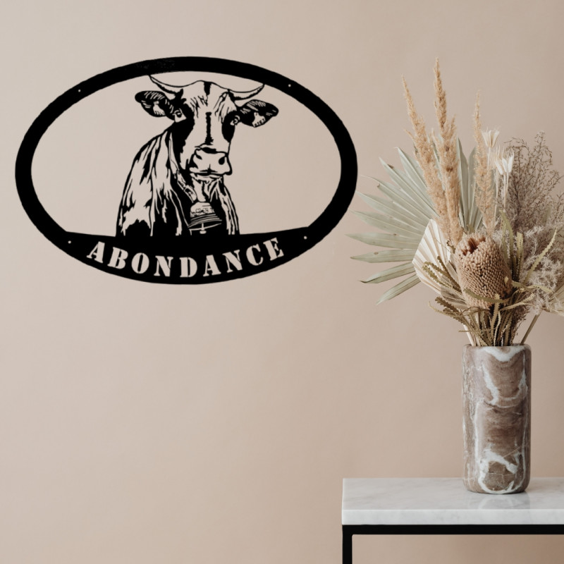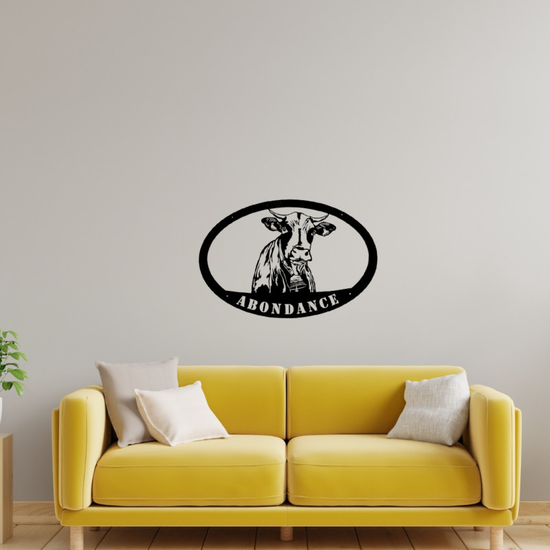 WANDDEKO aus METALL. Muster: ABONDANCE-KUH umgeben